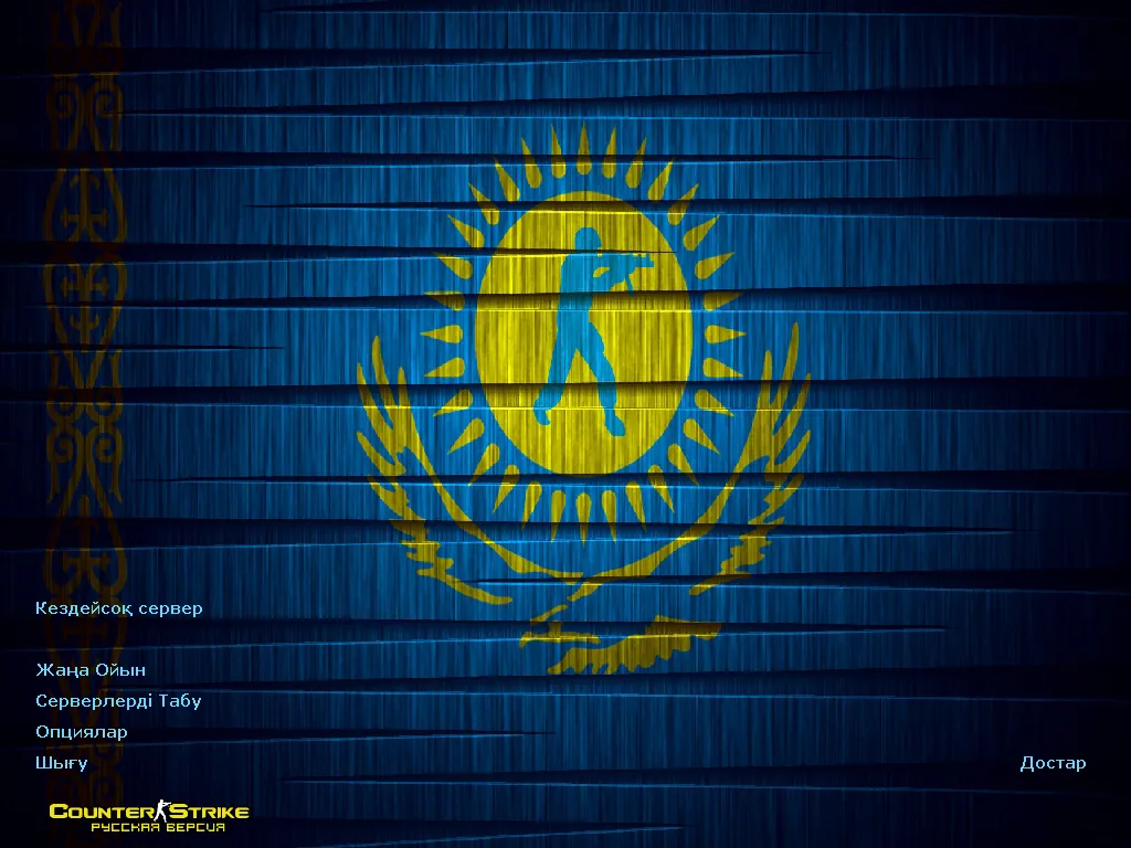 CS 1.6 Казахстан — сборка с оформлением в национальном стиле: меню украшено флагом, казахским орнаментом и символикой, создавая атмосферу родной игры. Интерфейс выдержан в голубо-жёлтой гамме, элементы меню и кнопки адаптированы под тематику, что сразу отличает версию от стандартных клиентов.