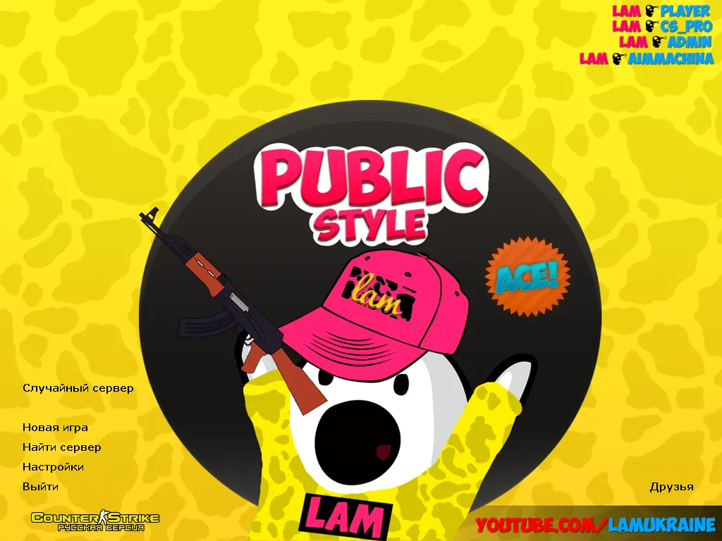 CS 1.6 от LAMukraine — яркая и запоминающаяся сборка, созданная в фирменном стиле автора: жёлтая гамма, мультяшный дизайн, обновлённое меню и уникальная атмосфера паблика. При первом запуске встречает красочный стартовый экран Public Style, а в игре ощущается аккуратная работа над интерфейсом и визуальной подачей.