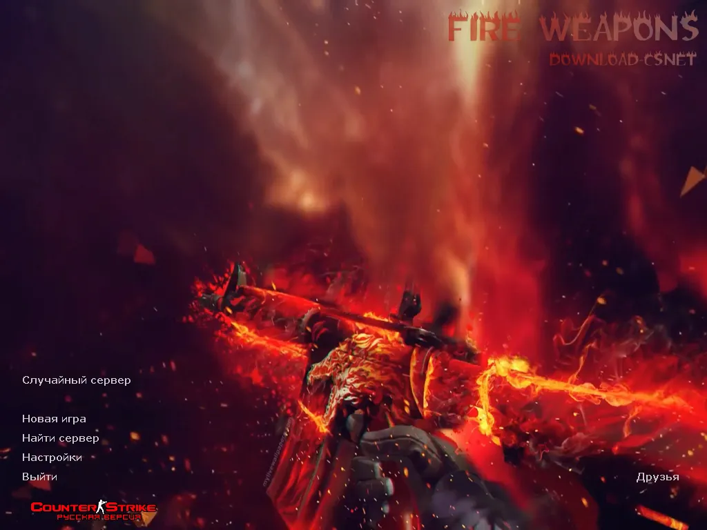 Главный фон CS 1.6 Fire Weapons встречает вас огненным вихрем: раскалённые всполохи, расплавленный металл и силуэт бойца с пылающим оружием передают атмосферу агрессии и жара. Меню оформлено в насыщенных красно-оранжевых цветах, а каждая деталь заставляет ощутить, что эта сборка — про скорость, мощь и яркий визуальный стиль.