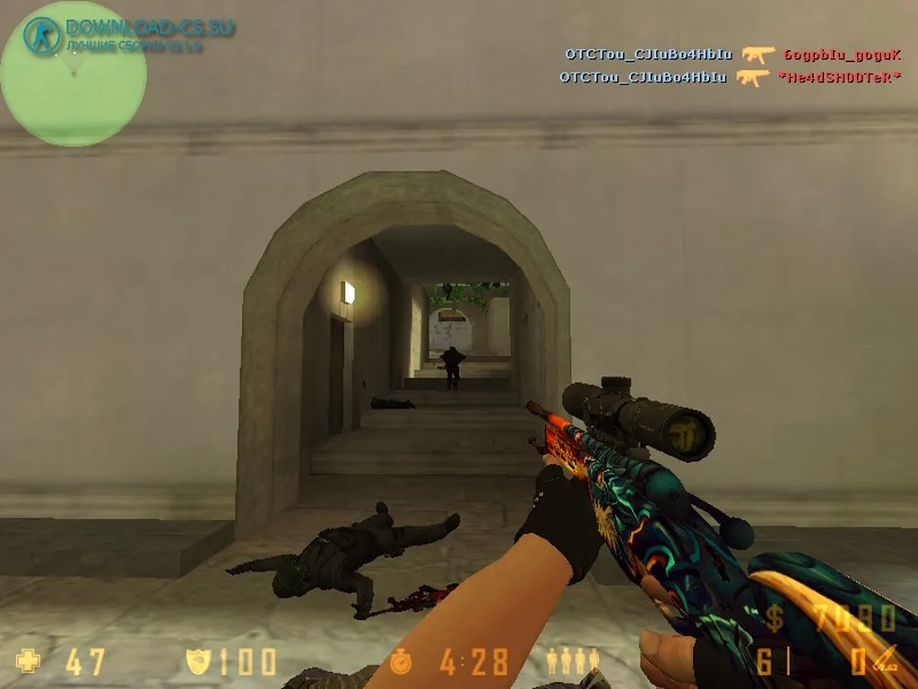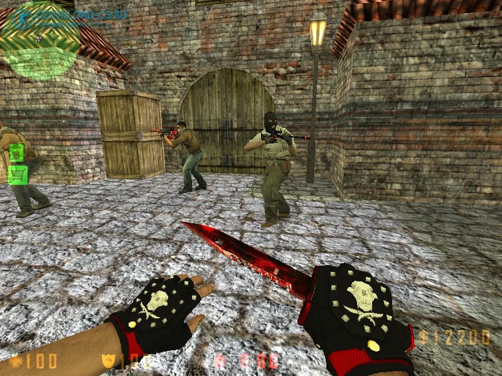 Модели игроков переработаны в сторону брутального, массивного стиля: терми выглядят агрессивнее, спецназ — технологичнее. Внутриигровые карты сохранены классические, но текстуры стали чуть ярче и чище — на светлых стенах и каменных поверхностях дробление и тени читаются значительно лучше. Оружие здесь — главное украшение сборки: красный M4 с огненным рисунком, яркие перчатки, ножи с анимацией, сочные модели AWP — всё это делает перестрелки зрелищными, но не мешает игре.