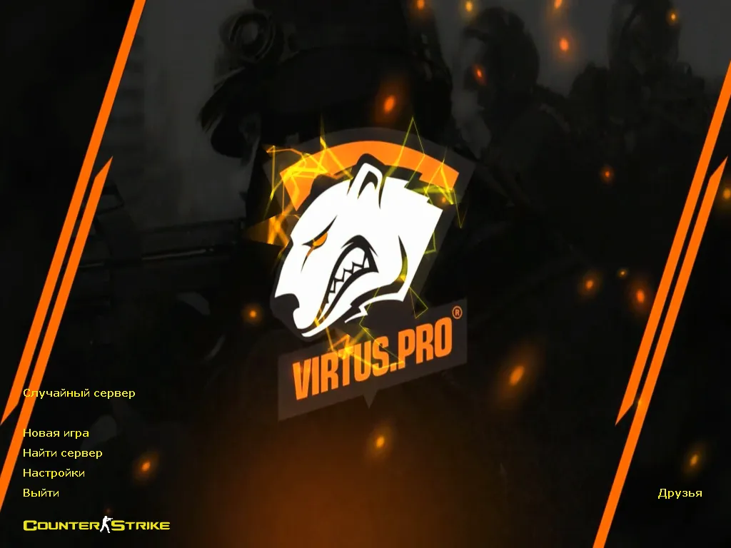 Сборка CS 1.6 от Virtus.pro выполнена в фирменных чёрно-оранжевых цветах команды, а главное меню оформлено в стиле легендарного состава VP. Логотип, фон, структура интерфейса — всё выдержано в одной тематике, благодаря чему игра сразу создаёт впечатление продуманной киберспортивной версии. Внешне сборка выглядит современно и аккуратно, но остаётся узнаваемой как классическая КС.