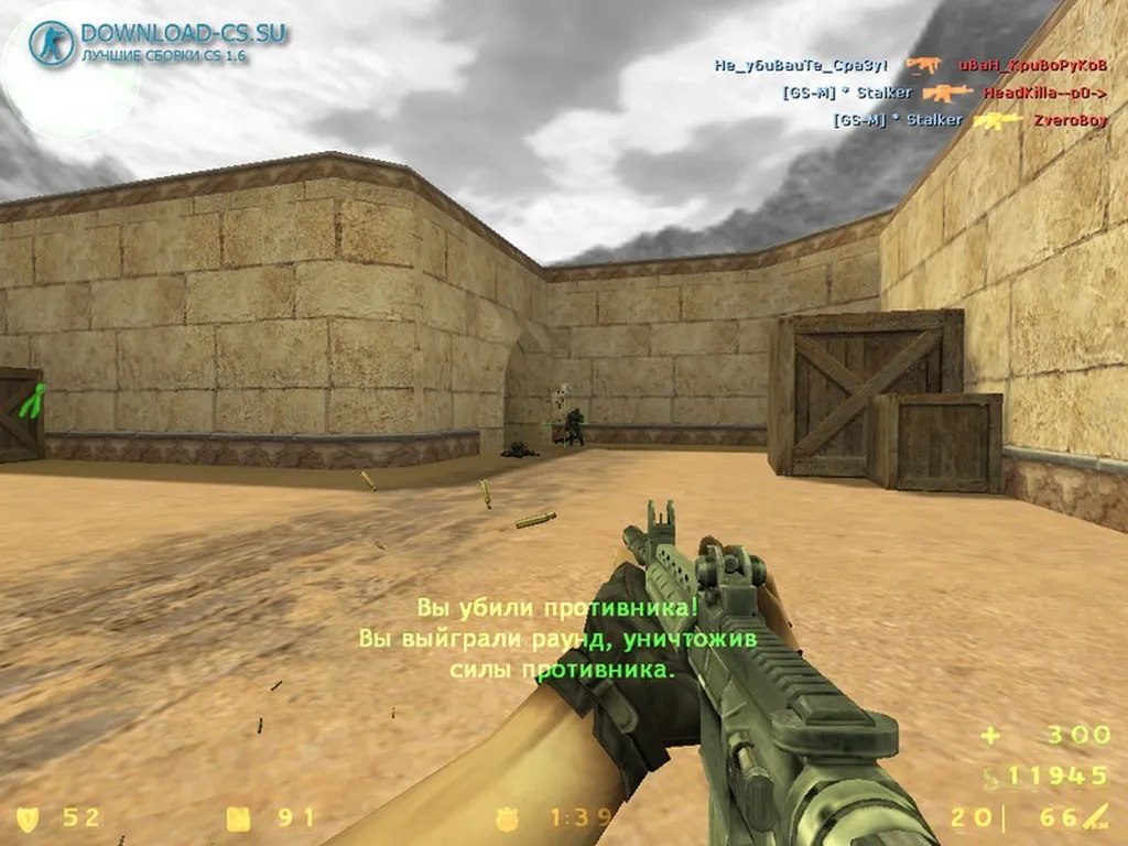 Внутри сборки CS 1.6 Stalker используются оружейные модели, выдержанные в стиле постапокалипсиса: грубая текстура металла, переработанные детали, объёмные звуки стрельбы. Карты выглядят контрастнее — песчаные, городские и каменные локации подчёркивают игровой темп, а визуальные эффекты вроде ярких выстрелов и отдачи создают ощущение плотного экшена. Боты действуют активнее, а HUD выполнен в минималистичном сталкерском тоне.