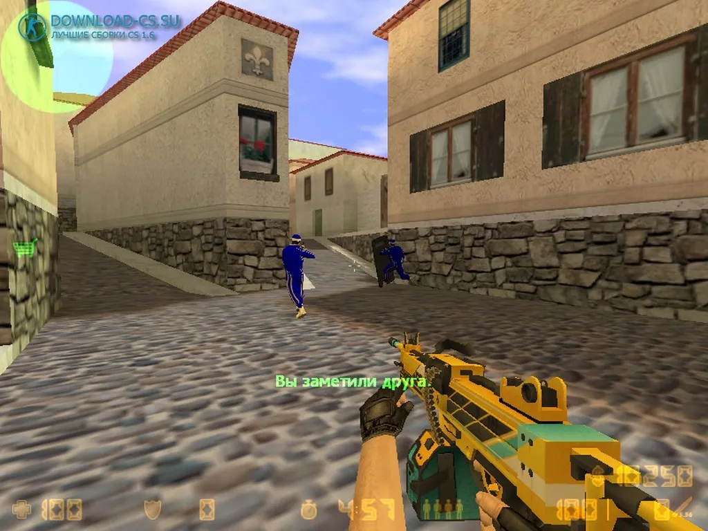 Сборка CS 1.6 от Старого создаёт заметную индивидуальность благодаря оформлению: модели игроков разделены по командам — террористы в красной форме, спецназовцы в синей, на оружии реализованы скины из CS:GO, интерфейс меню переработан под стиль автора сборки. Визуал выглядит современно, но игра остаётся классической по ощущениям.
