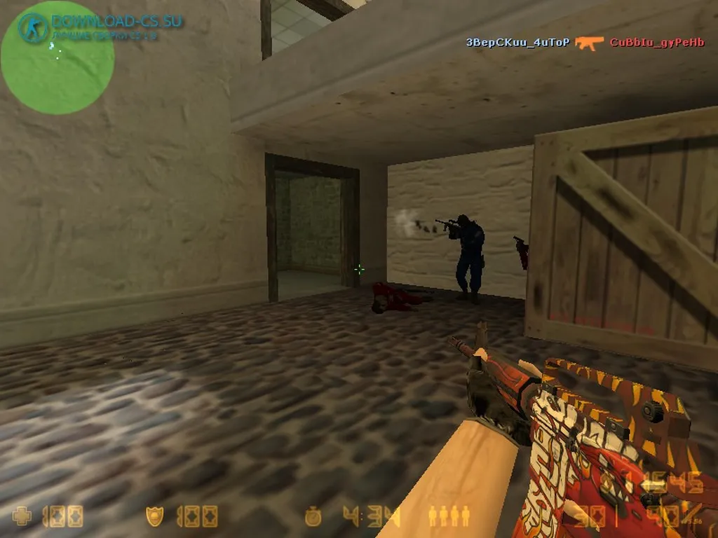 Сборка CS 1.6 от Maqside оформлена в авторском стиле блогера: меню получило современную тематику, модели игроков перекрашены — террористы красные, спецназовцы синие — что помогает быстрее ориентироваться в бою. Оружие снабжено скинами из CS:GO и выглядит свежее, чем в стандартной версии, при этом игра сохраняет привычную механику.